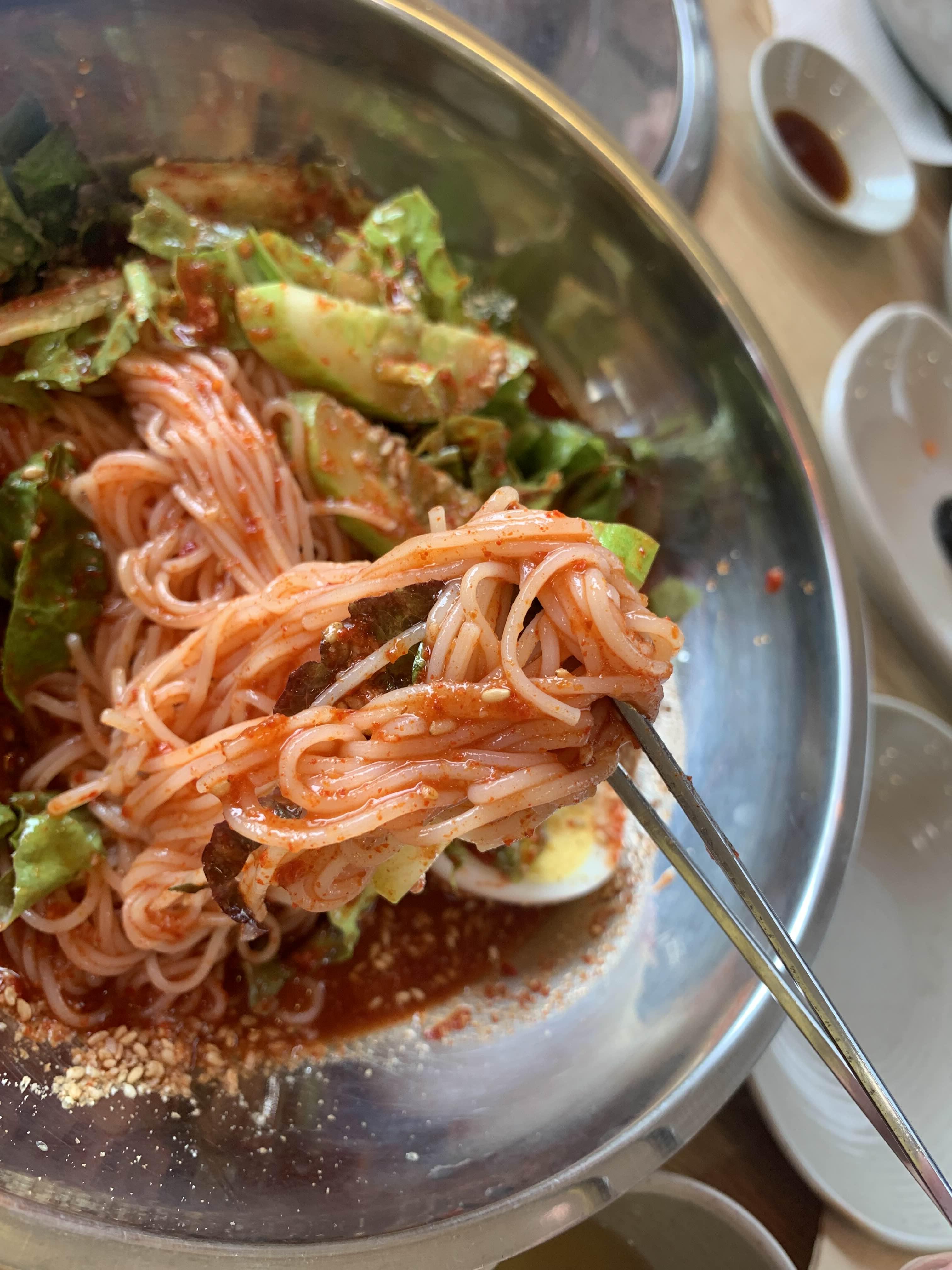 이게 유명한 비빔국수입니다. 상추와 오이가 들어가 있구요. 참깨가 많이 들어가 있는데 비빔양념이 정말 칼칼하고 매콤한게 맛있습니다.