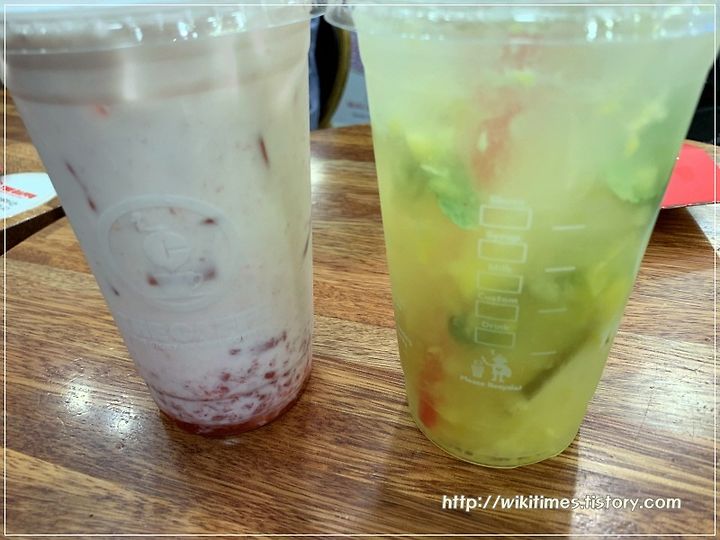 두개를 빨대로 잘 섞이게 저어서 마시면 됩니다. 개인적으로 맛있는 음료들이었습니다. 딸기라떼에는 딸기 과즙이 많이 들어있었구요.