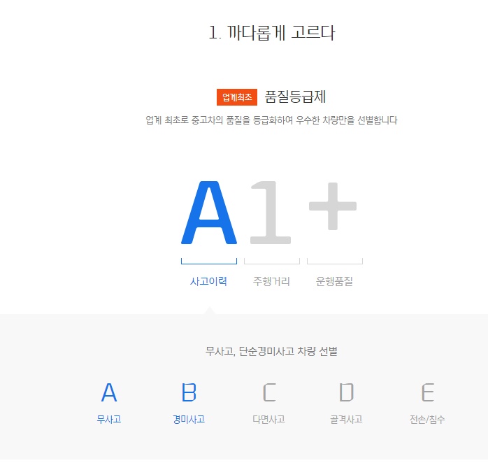 사고등급은 성능점검 기록부를 기준으로 책정하며, 단순 도장 및 소모성 부품교환은 사고성으로 보지 않는다고 하네요.