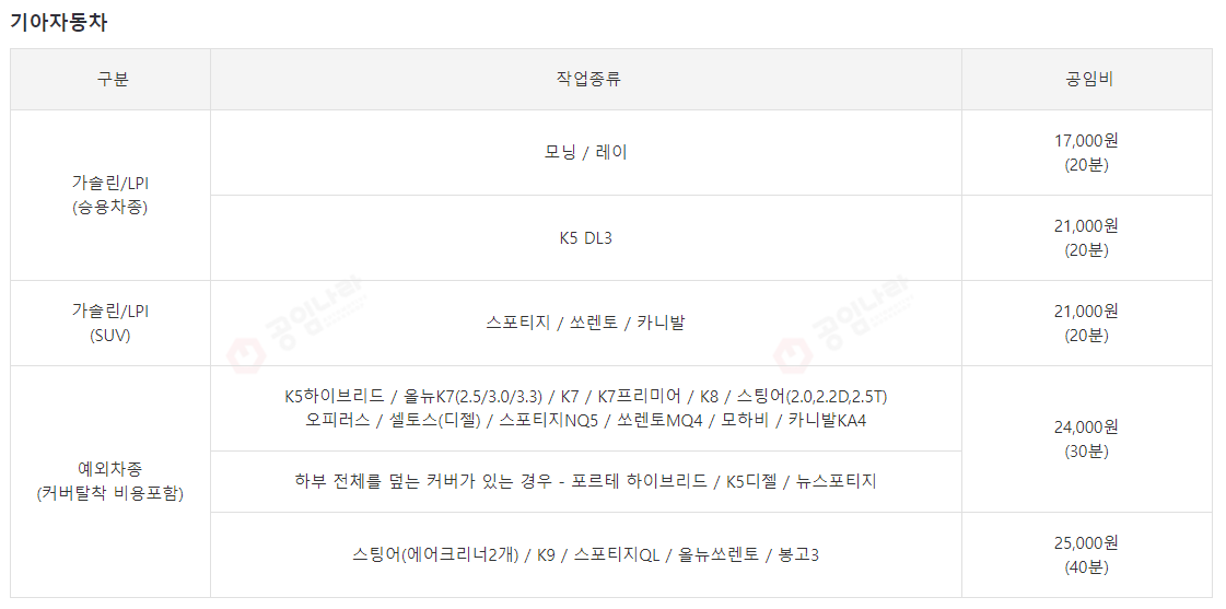 현대의 프리미엄 라인인 제네시스는 조금 더 나오네요.특히 에어크리너를 2개 쓰는 차량이나 대형차량은 시간이 40~50분이나 걸리는걸로 되어있어서 비용이 좀 나오는 편입니다.