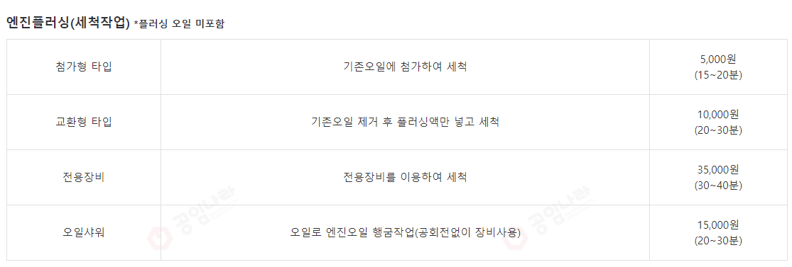 6. 엔진플러싱 작업도 크게 비싸지는 않는데 전용장비를 사용해서 깨끗하게 할 경우 35,000원까지 들어가니 참고하시기 바랍니다. 그냥 엔진오일만 교체하는것보다는 플러싱액을 넣거나 기존 엔진오일에 첨가를 해서 세척하는 방식이 있네요.